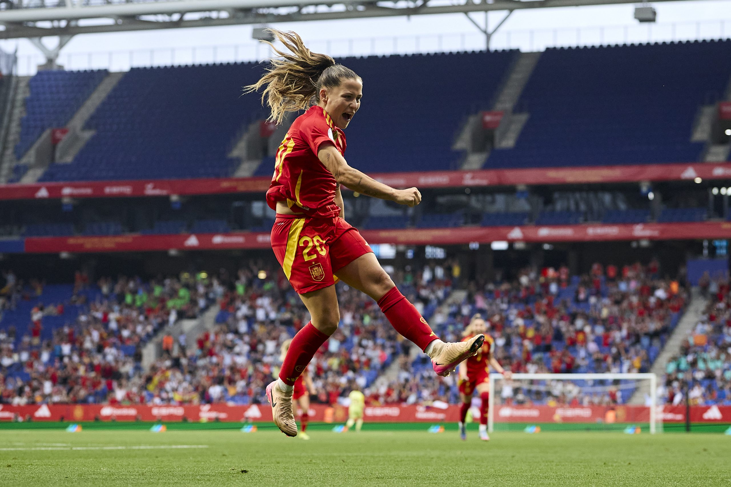 La selección femenina celebra el gol marcado por Claudia Pina. RFEF